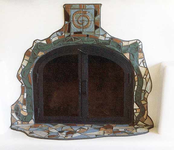 Fireplace High-fire tile mosaic around a fire place; private comission for a house in Santa Fe, 1999.