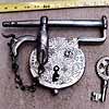 In 1991, I was working in Ecuador for the Swiss foreign aid agency "SWISSCONTACT" teaching blacksmithing classes. In the town of Cuenca, I got introduced to a man by the name of Manuel Guerra who was making chestlocks, doorlocks, padlocks and other hardware in a tradition carried on from medieval times. I fell in love with his work and actually asked myself what I was doing, teaching forgework in a place that had its own longstanding tradition. But such is the irony of life, and while I continued giving my evening classes, Manuel allowed me to come in during the days and work with him. He taught me the making of a padlock similar to the one shown above.