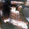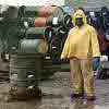 Worker warming himself at a fire in an oildrum reconditioning and manufacturing plant in Memphis TN.