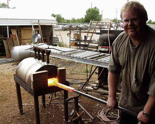 Maybe the best design for long heats. Notice the slightly offset row of burners overhead. The forge is at its hottest towards the right. With three or four irons in the fire during production, cold bars are being put in at the left and moved to the right as they get hotter.