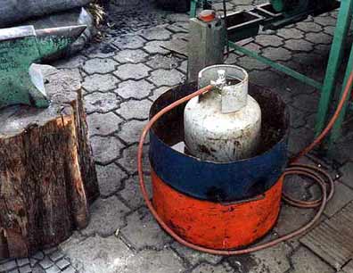 Water Bath for Liquid Gas Cylinder Once I was an oildrum. Now I keep liquid gas cylinders at the vocational school SECAP in Cuenca, Ecuador from getting too cold. The system is simple. They can swim in my water which keeps them warmer and pressurized while running the gas forges.