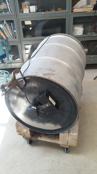 Barrel02 Peter's loudspeaker is made up of an electromagnetic sound generator, a magnet and an oildrum.