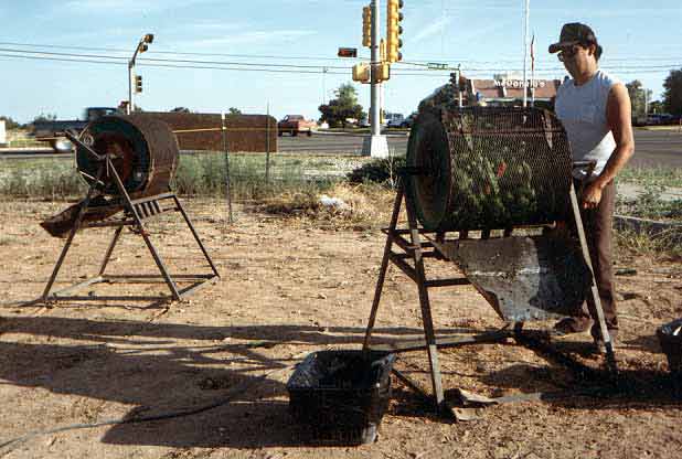 Chile has maybe been roasted by the side of the road in Santa Fe forever. Every year in late summer its mouthwatering smell fills the air. The roasters are made from expanded metal with propane burners underneath. The sides are old oildrum lids (note the caps), and the shoots were oildrums before too (note the bulges).