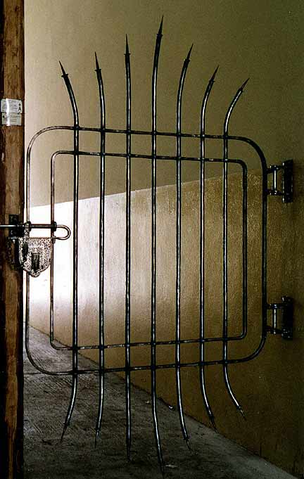 The gate which is shown in an exhibition setting here and with an art padlock by Manuel Guerra was built to go directly over the front entrance door of a German foreign aid worker in Ecuador. The poor guy had been robbed twentythree times. He was a former prize boxer and had taken to beat up burglers whenever he could catch them. The design was partly meant as a warning to these burglers, and partly it was inspired by the lines of an electromagnetic field in a transformer. The owner was also an engineer by profession.