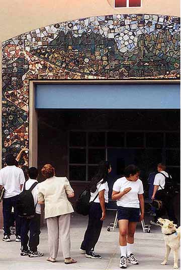 Las Cruces Middle School Students and teachers looking for their tiles in the mural during the inauguration ceremony, May 1998.
